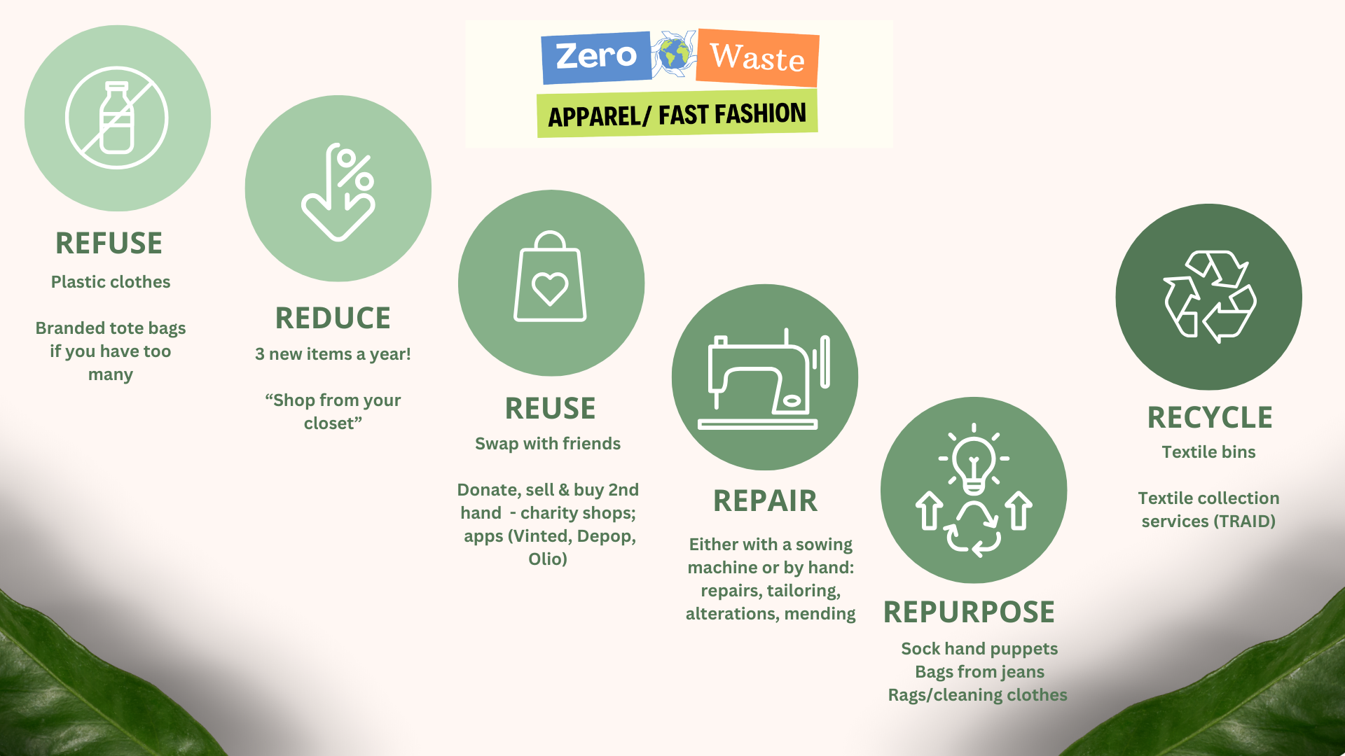 This slide is a useful summary of the actions you can take. Starting with refusing items composed of plastic, it efficiently summarises the steps we can follow to be more sustainable with our fashion choices.ate Waste” websites for practical and helpful ideas and food-waste recipes.