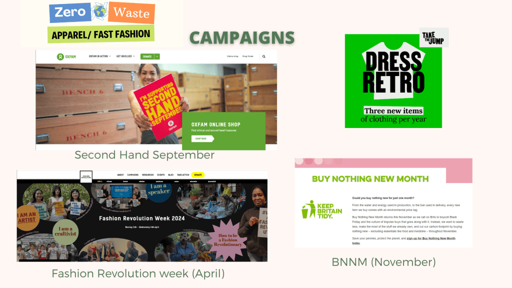 - Sustainable Fashion Week 27th September – 5th October 2025 aims to bring people together to drive change, inspiring people to think globally but act locally. Their site has a number of useful, eye-catching resources. For example, take a look at their Fashion Industry Overview page and digital handbook made for.