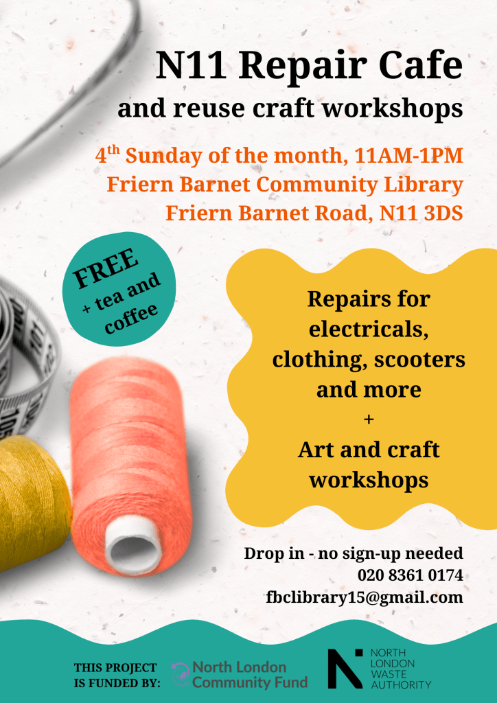 Visit the Friern Barnet Community Library Repair Cafe every fourth Sunday of the month between 11:am to 1pm, for a day dedicated to fixing, creating, and reusing! Our monthly Repair Cafe is completely free and the ideal spot to bring your broken items for our talented repairers to fix, including small electrical devices and other items.