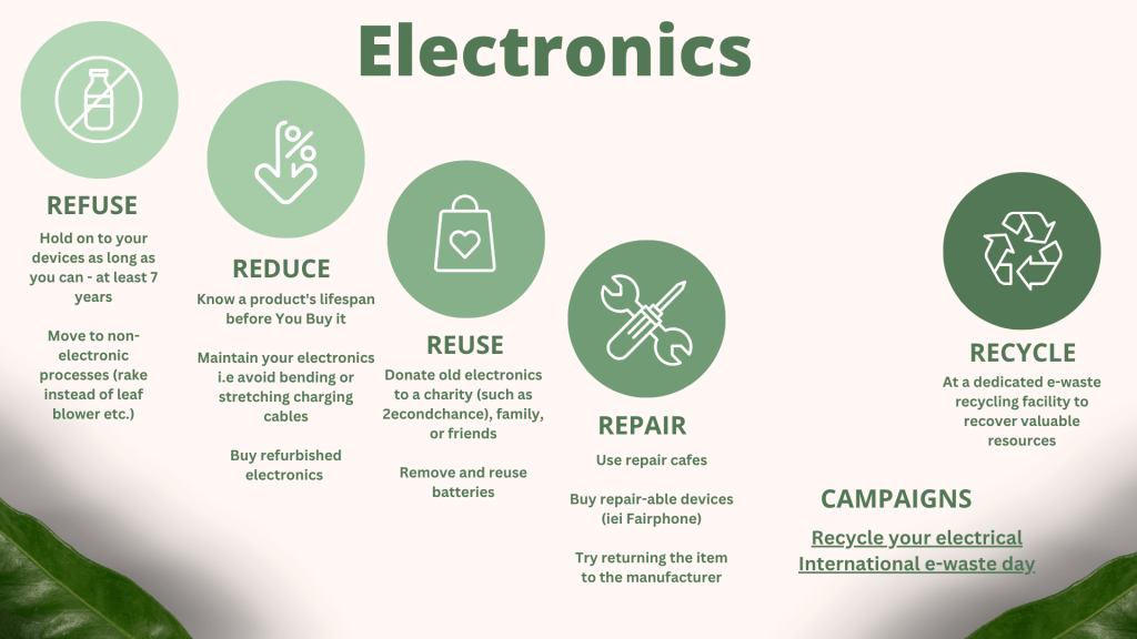 The slide below efficiently shows a number of ways you can reduce your tech’s carbon footprint and negative impact on the environment from ‘refusing’ (for example refusing to upgrade to a new device) to recycling.