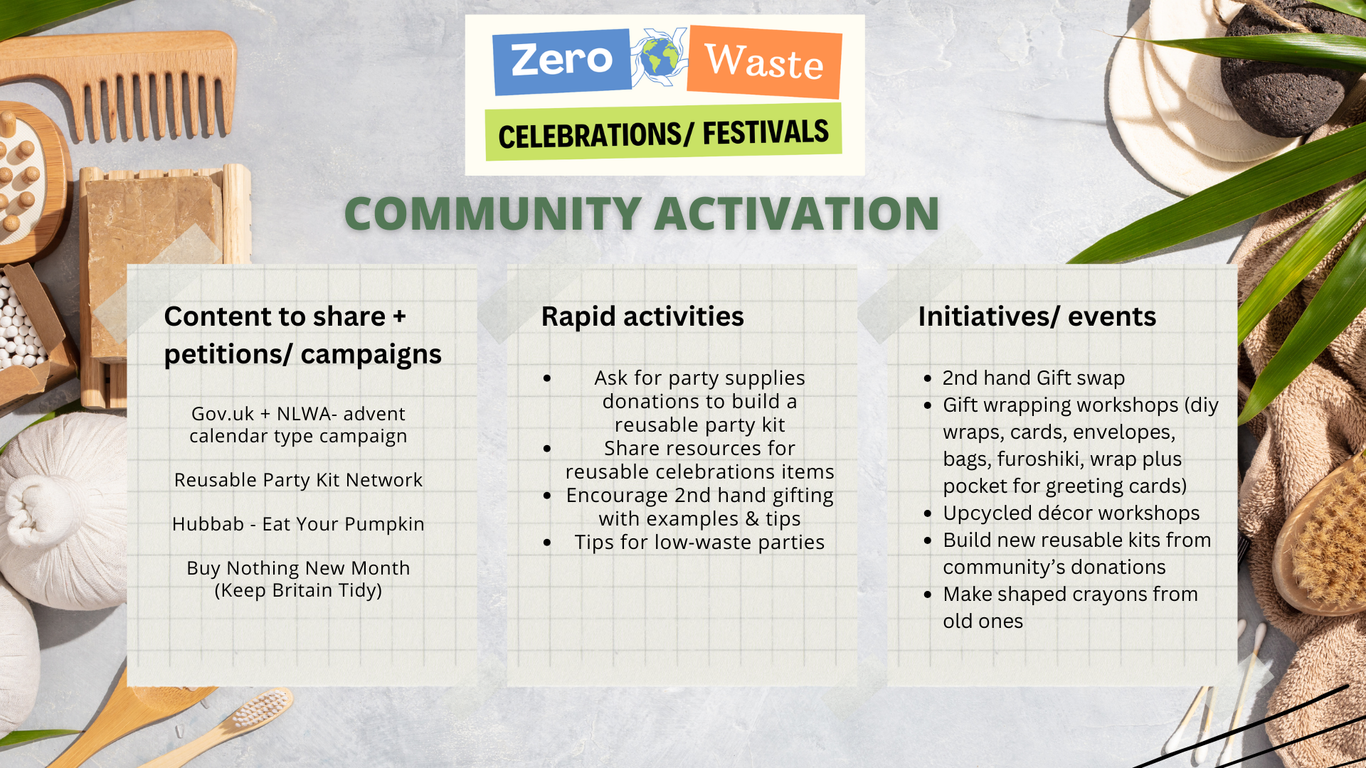 - Ask community members to donate 2nd hand party supplies, such as plates, cups, and decorations, to build a reusable party kit – find guidance here
