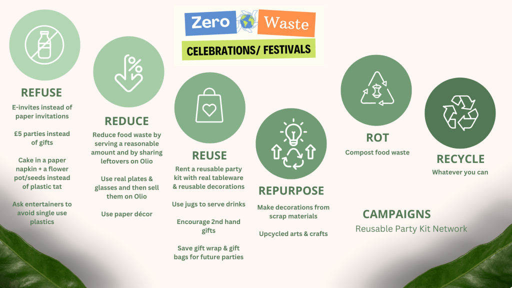 The slide below shows a summary of the actions you can take to reduce waste in your celebrations. Simple steps such as reusing jugs to serve drinks or avoiding single use cutlery are very effective.of ways you can reduce your tech’s carbon footprint and negative impact on the environment from ‘refusing’ (for example refusing to upgrade to a new device) to recycling.